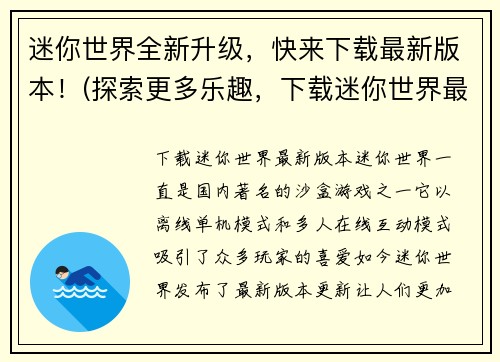 沙盒模拟器:创造你的游戏世界 什么是沙盒模拟器沙盒模拟器是一个让玩家可以创建和编辑自己的游戏世界的游戏,玩家可以自由地添加、删除和修改游戏中的元素,包括地形、建筑物、道具、NPC等等。沙盒模拟器通常不...